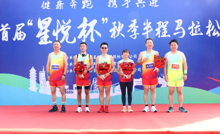 隨后,舉行隆重頒獎儀式,公司領導分別為前三名選手頒發獎牌和鮮花,全體參賽選手合影留念,星船城首屆“星悅杯”半程馬拉松比賽圓滿結束。